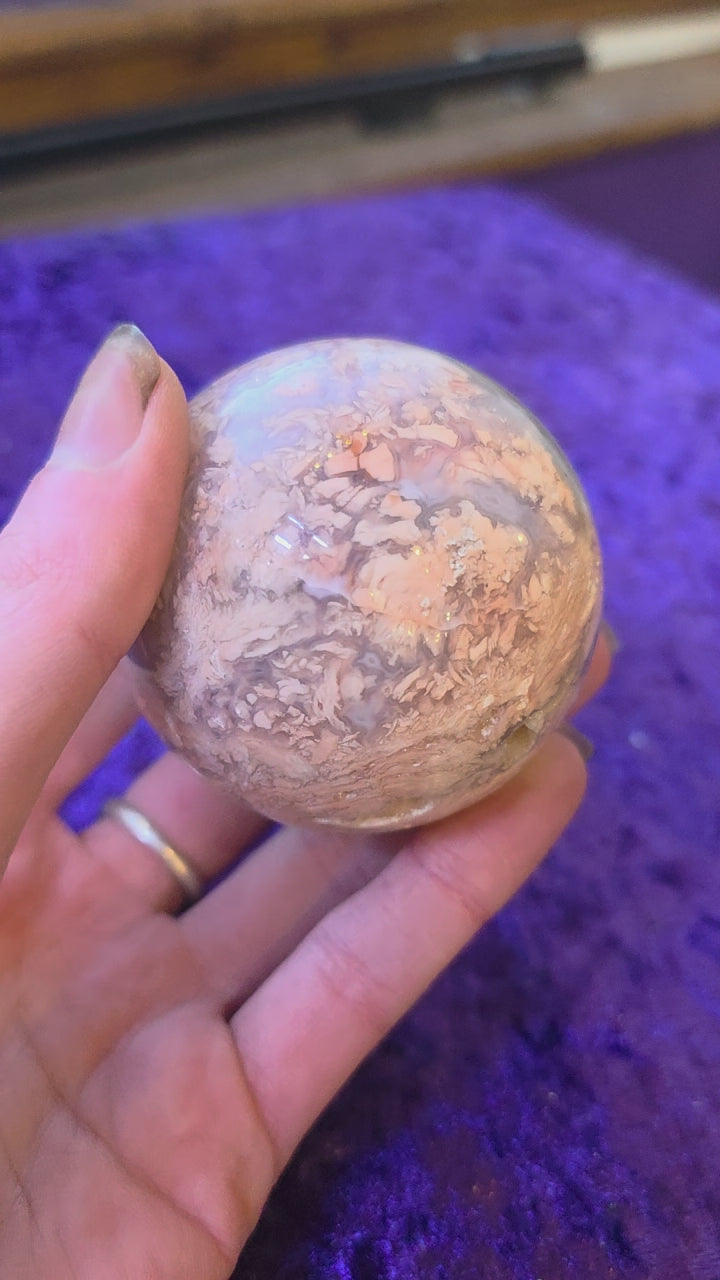 This exquisite Cotton Candy Pink Agate Sphere serves as a beacon for emotional equilibrium and inner tranquility. Revered for its gentle yet potent energy, this stone is believed to dissolve anxiety and foster a profound sense of serenity. Beyond emotional support, it functions as a guardian against negativity, establishing an energetic sanctuary of positivity around you. The sphere's delicate rose hue resonates deeply with the Heart Chakra, facilitating the cultivation of compassion, authentic connection, and emotional harmony. Whether seeking to fortify your resilience or amplify your inherent confidence, this natural wonder encourages the emergence of your most courageous self.